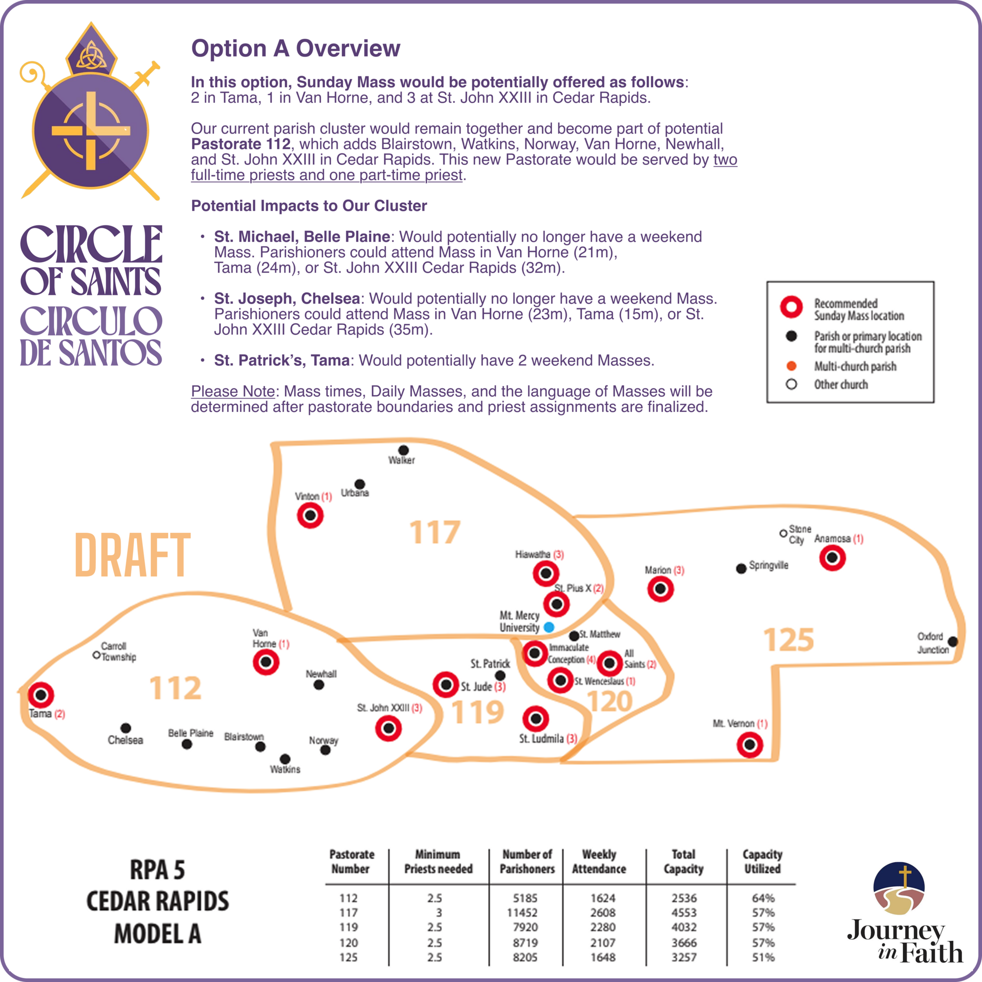 The Archdiocese of Dubuque has released the first set of potential map options, each map proposes how we could restructure parish clusters into larger pastorates. These changes would affect our parish cluster, including where and how Masses are celebrated.
